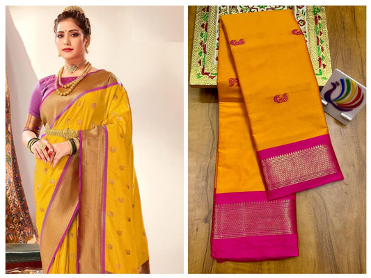 Material: Known for its soft and lightweight feel, ensuring comfortable drapes. Color: Yellow with pink saree ...