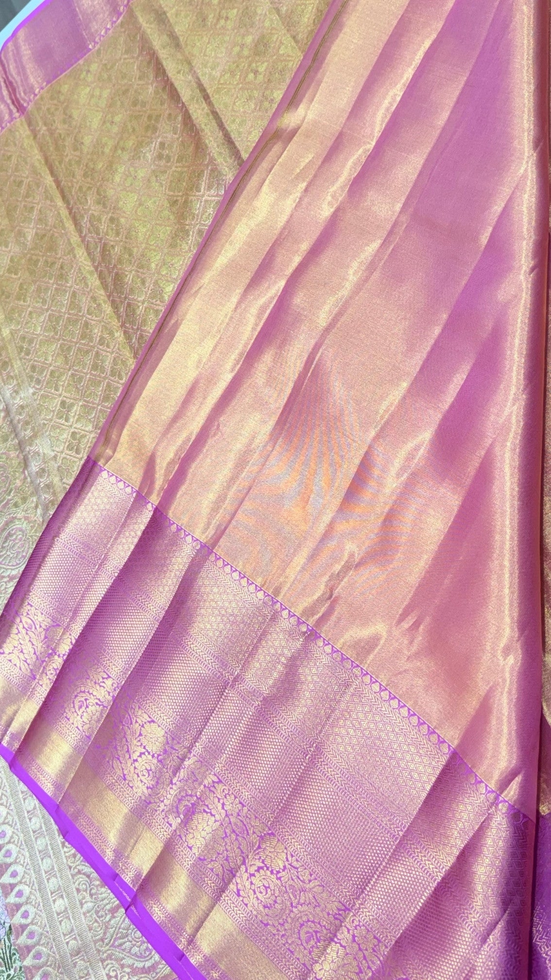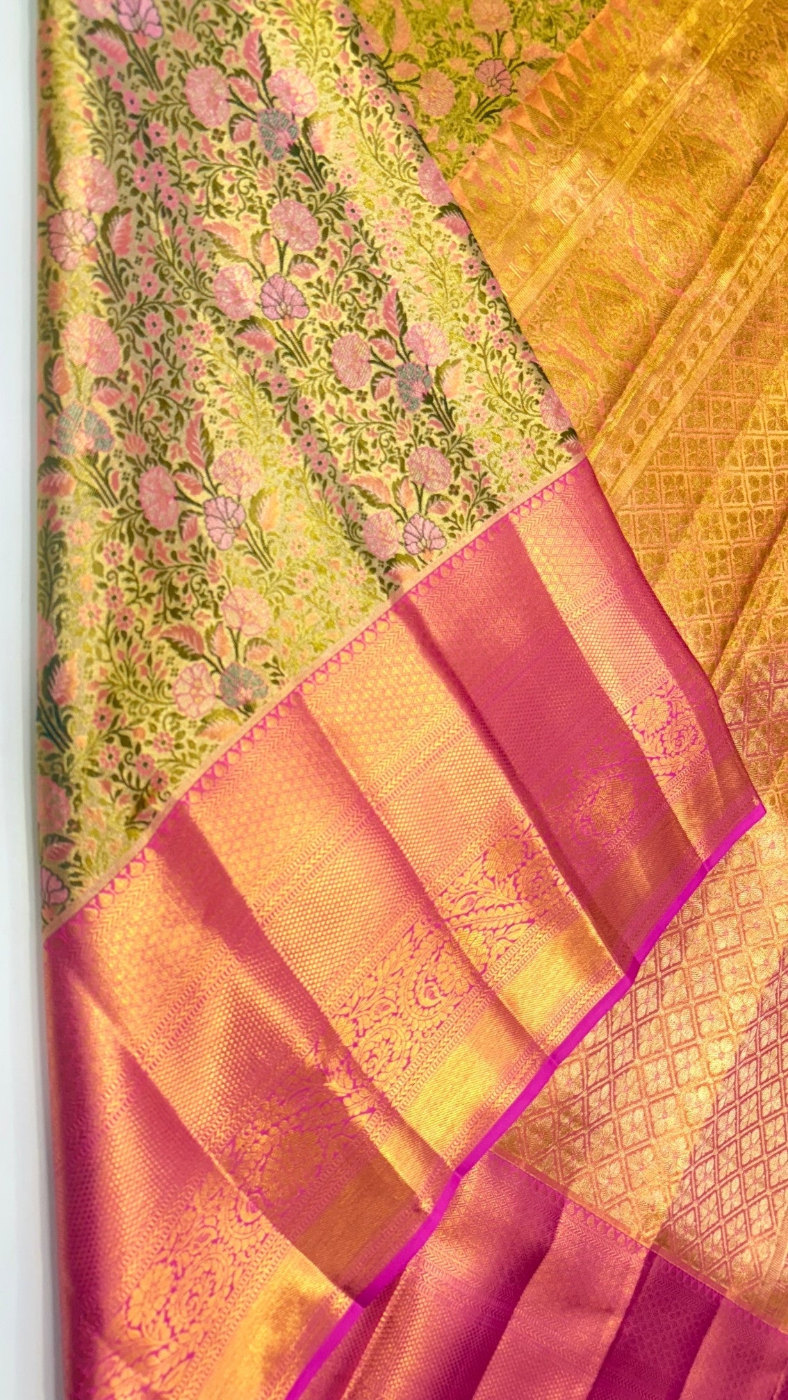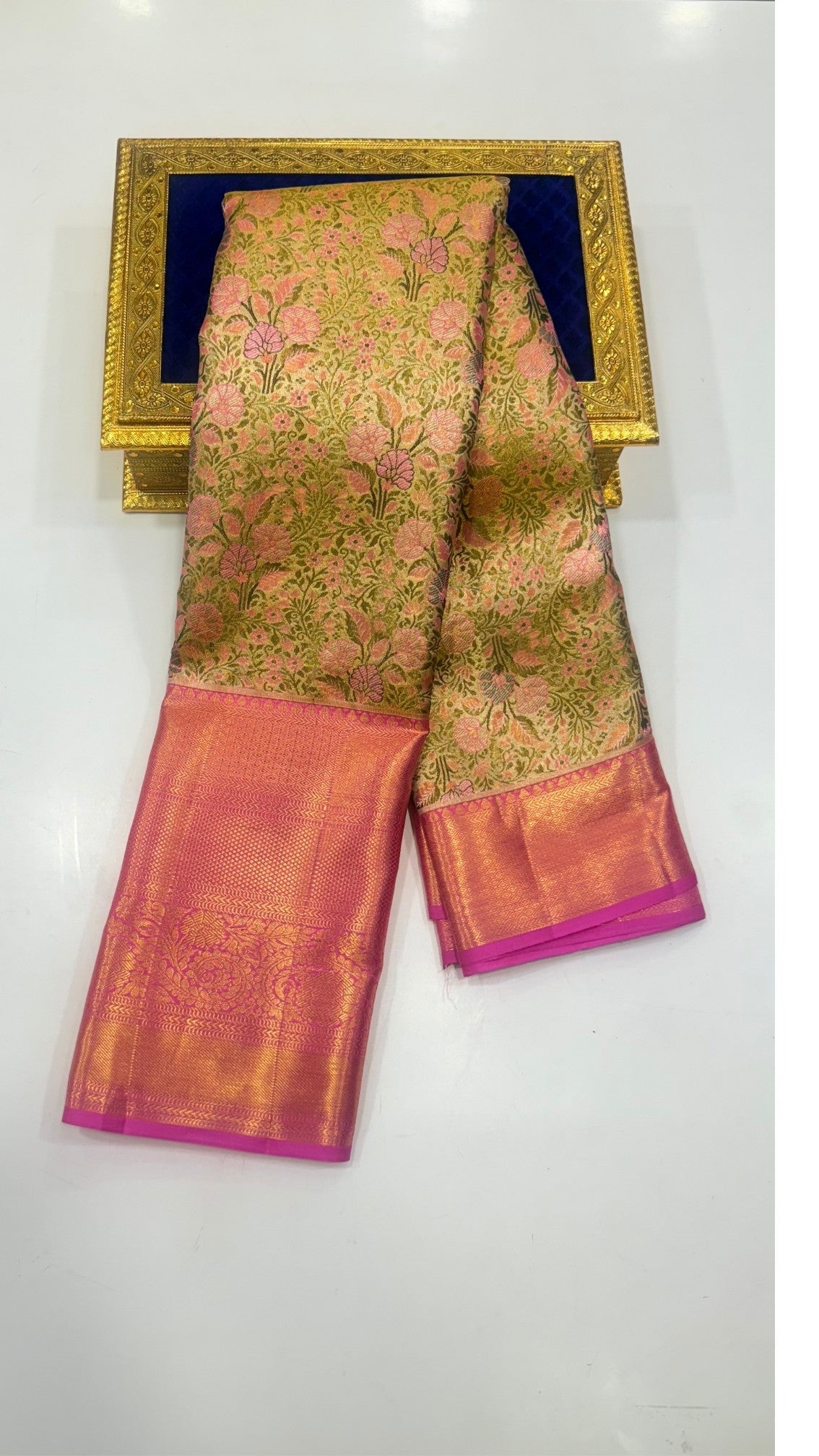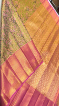 3D Leaves Brocade with Baby pink Border Pure Kanchipuram Silk Saree