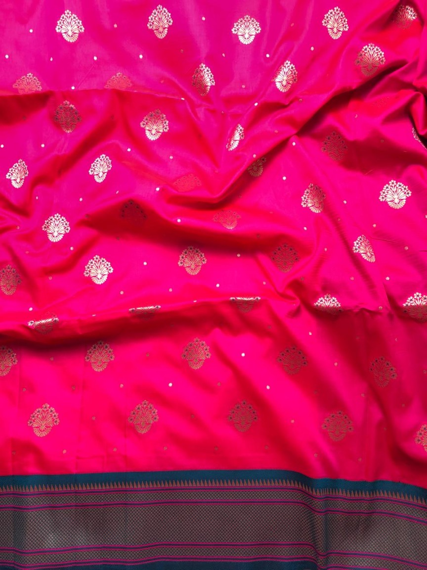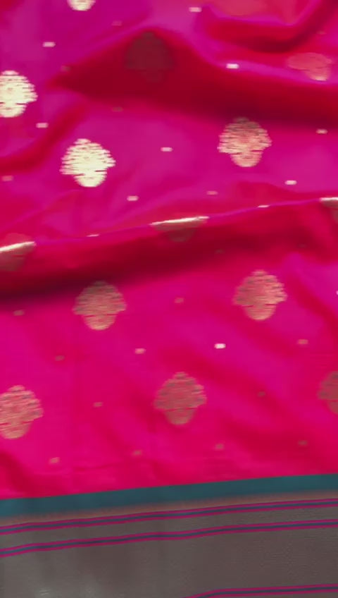 A handloom saree is woven by hand on a traditional loom, often using natural fibers like cotton or silk. These sarees are known for their craftsmanship, intricate patterns, and unique texture.