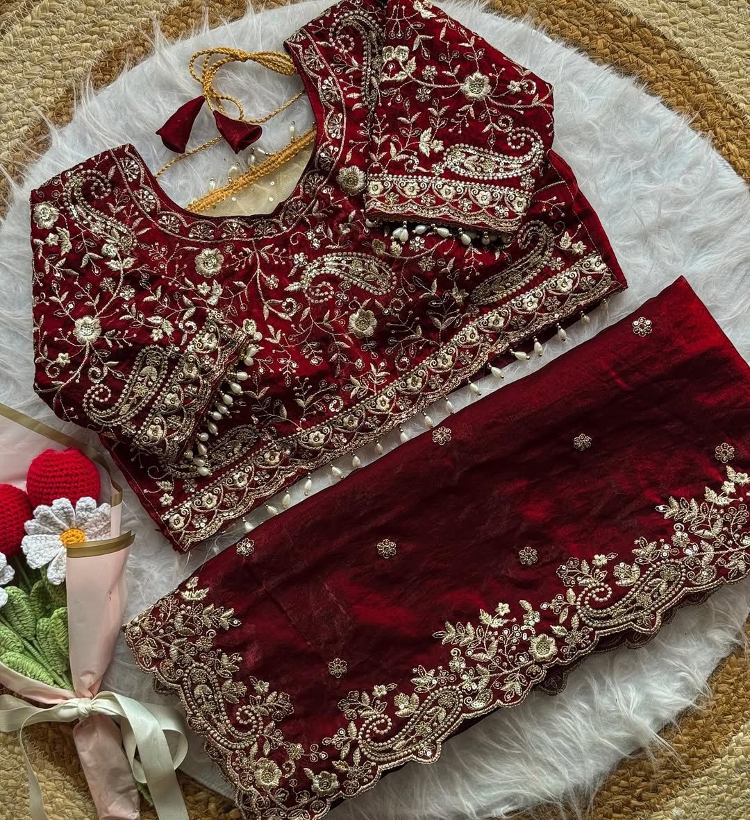 Blouse: No hassle! Comes with a fully stitched embroidery blousethat matches perfectly. 👚