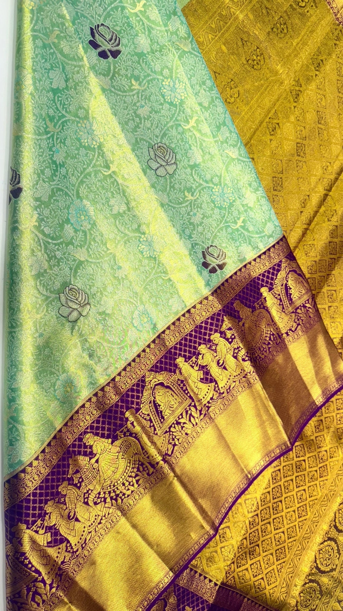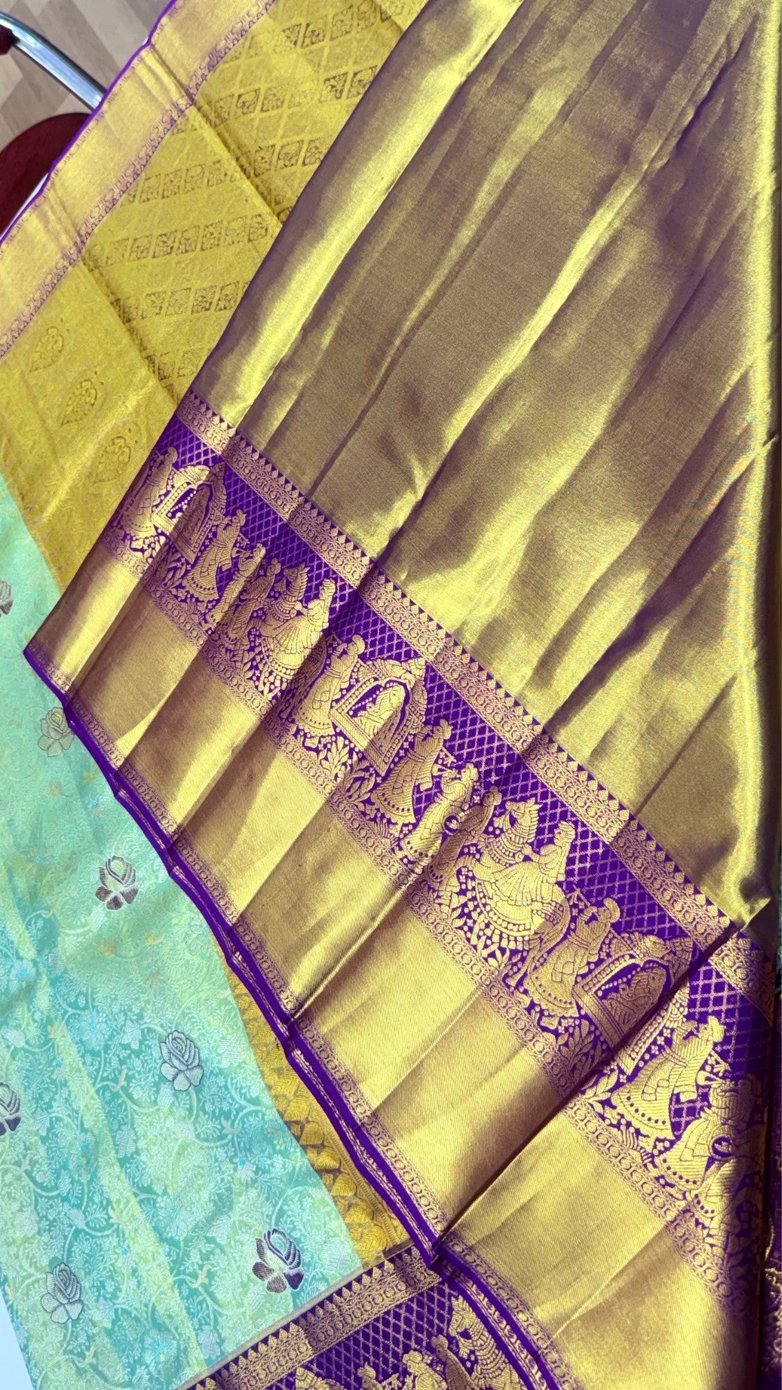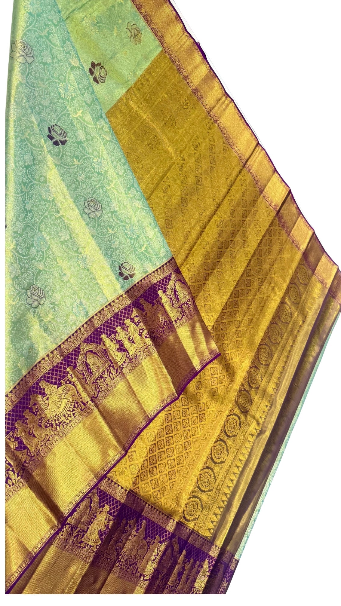 Pallaki Border Design: The borders showcase intricate Pallaki (palanquin) motifs, adding a unique traditional touch and grandeur.