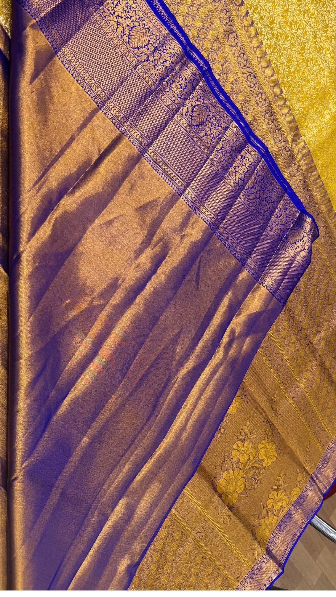 Mustard Yellow with Royal Blue Pure Kanchipuram silk saree