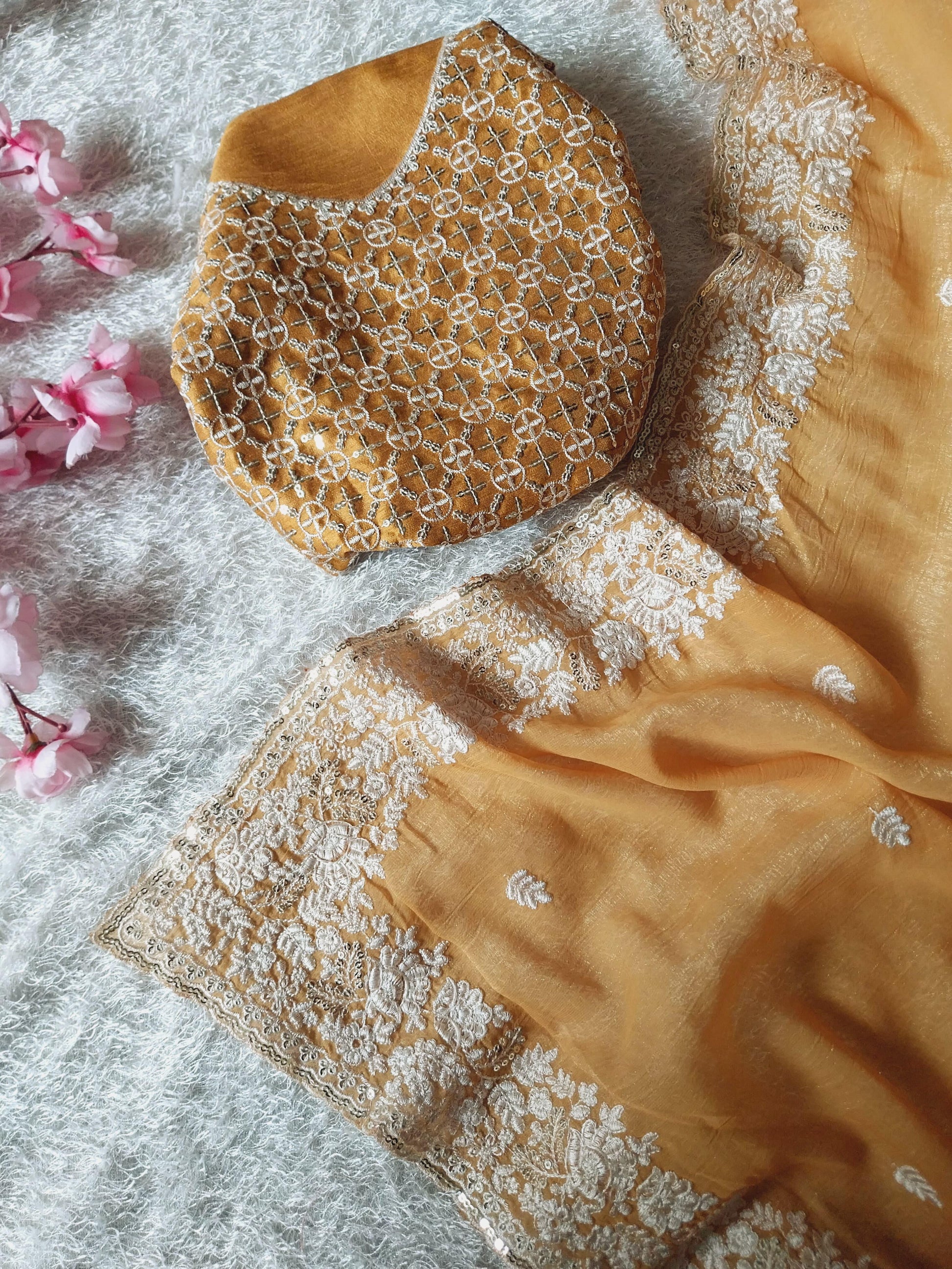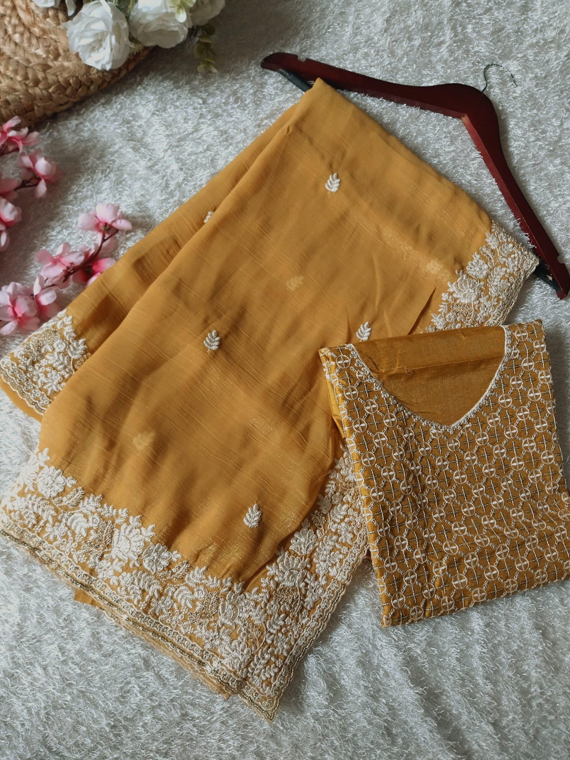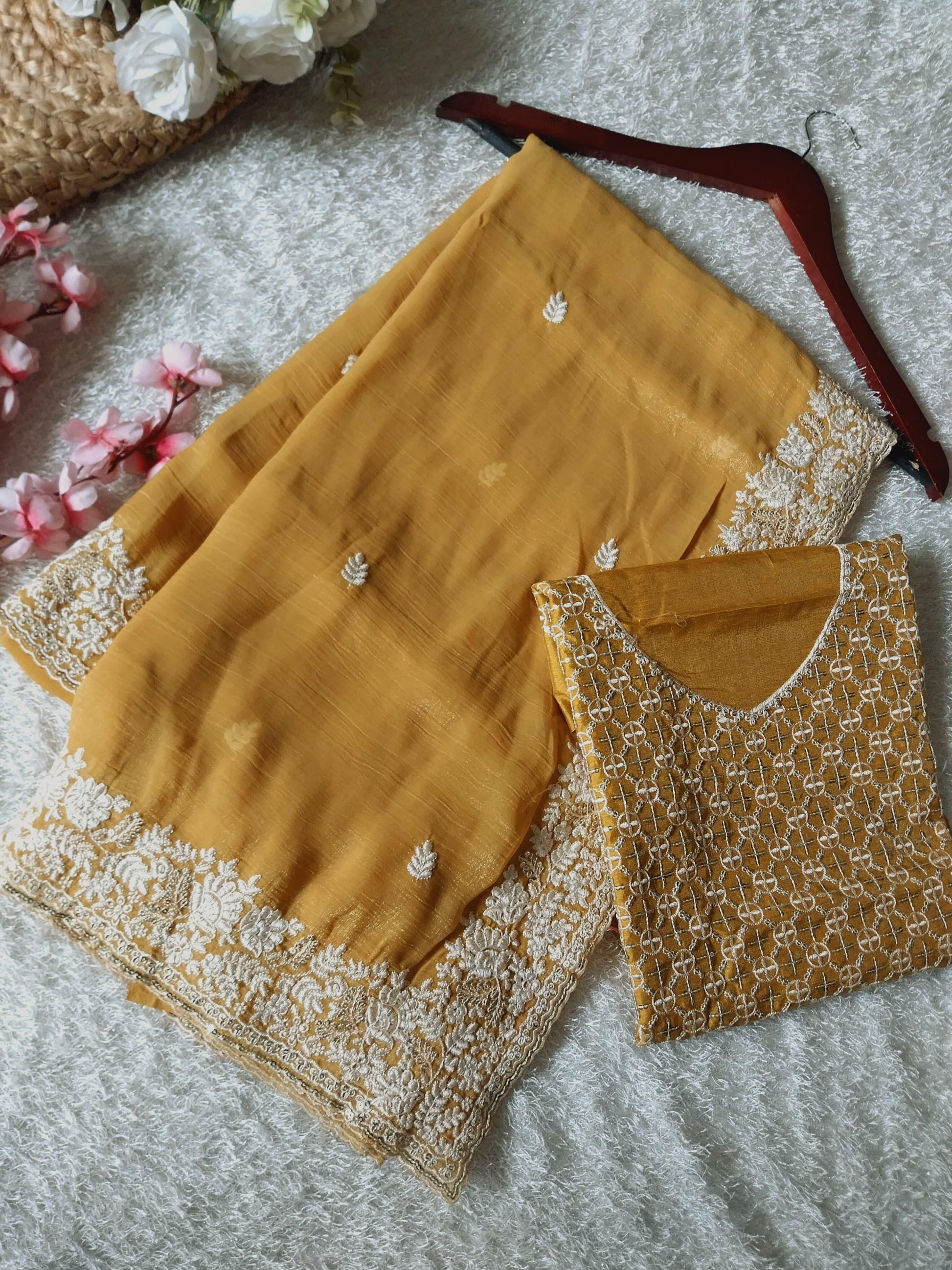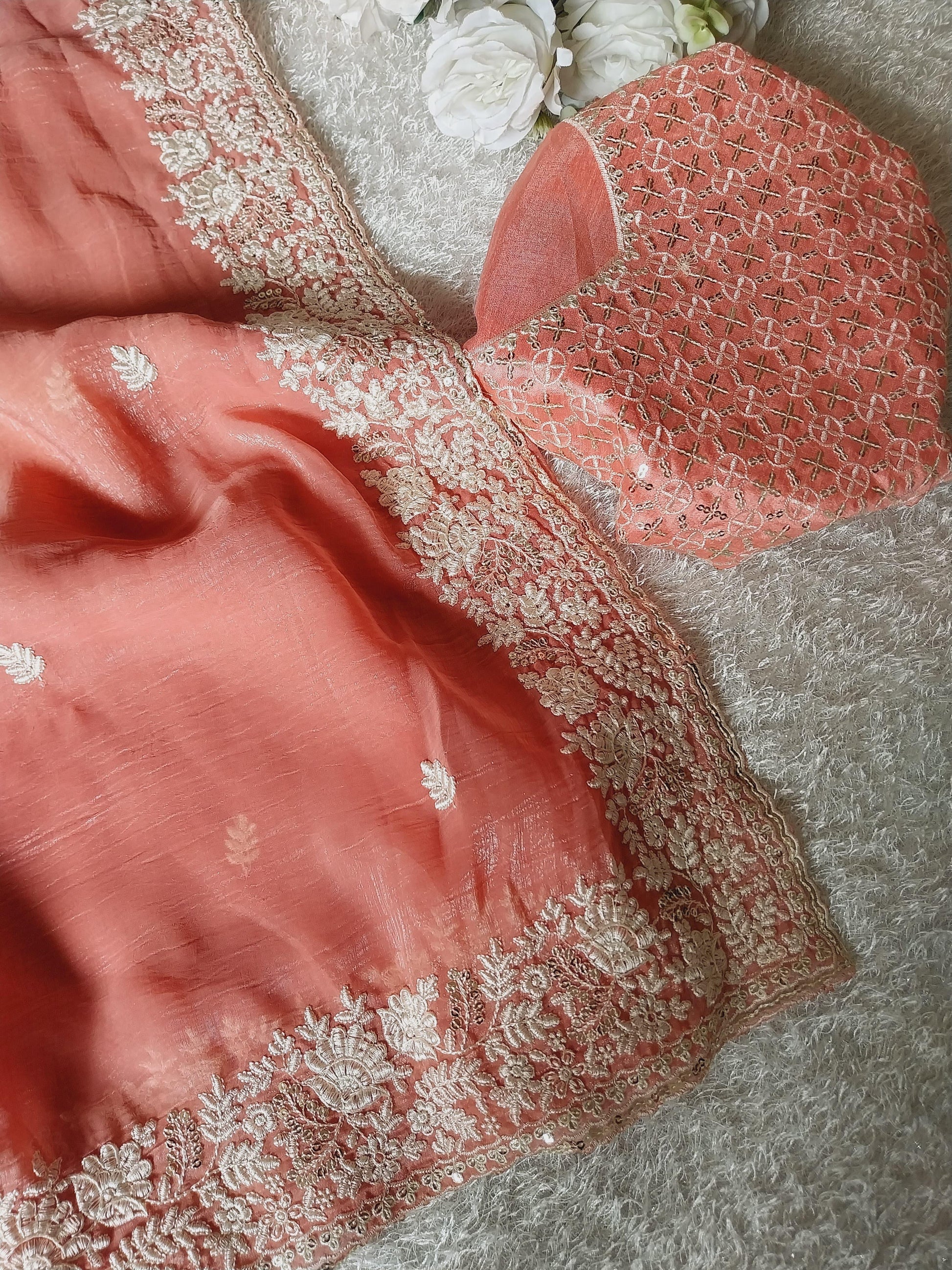 Work: Heavy Embroidery to match the saree’s stunning craftsmanship