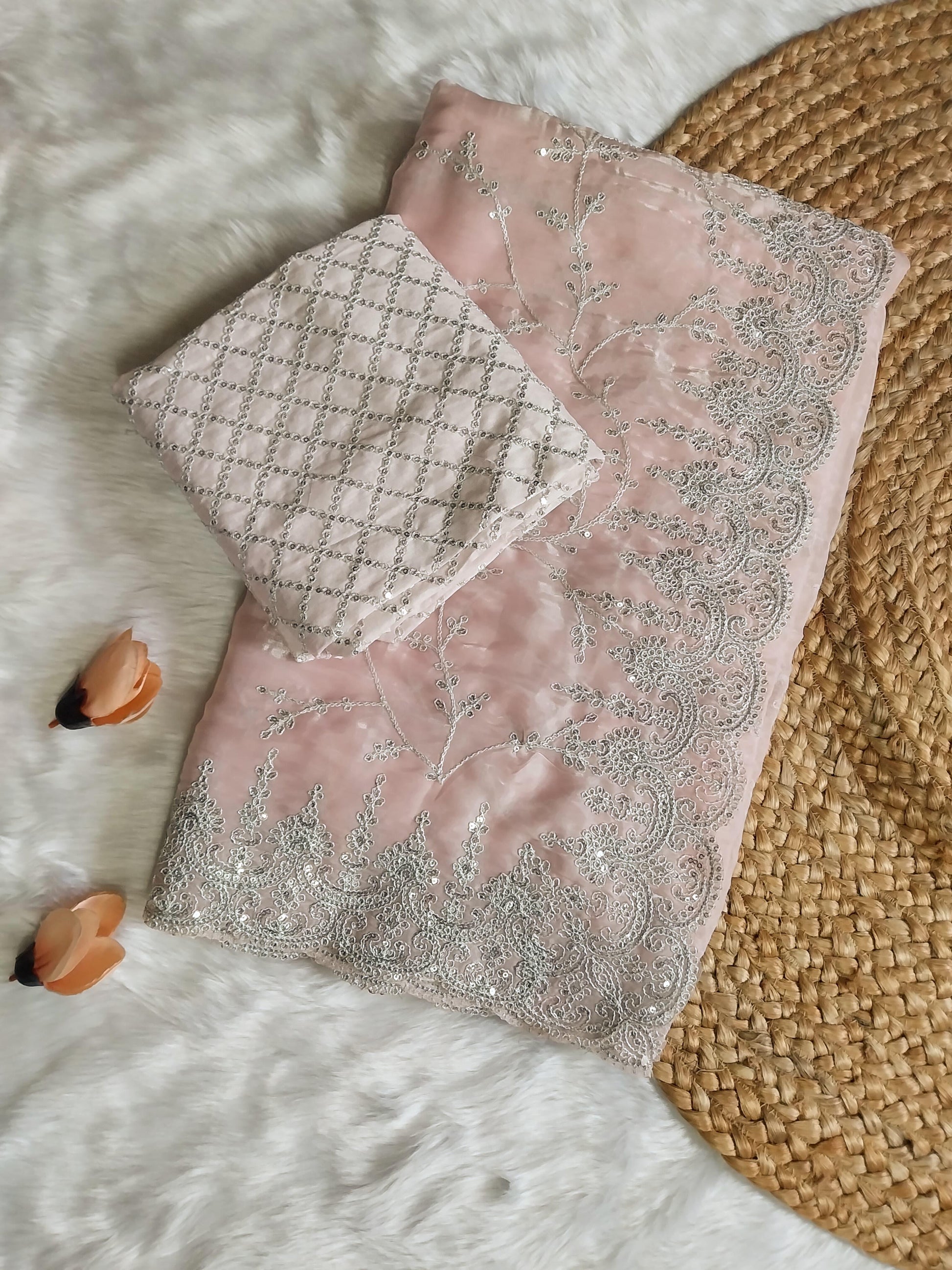 This saree features silver floral embroidery, cutwork borders, and rich handwork in silver zari & sequins, giving it a look that’s both luxurious and effortlessly elegant. 🌿