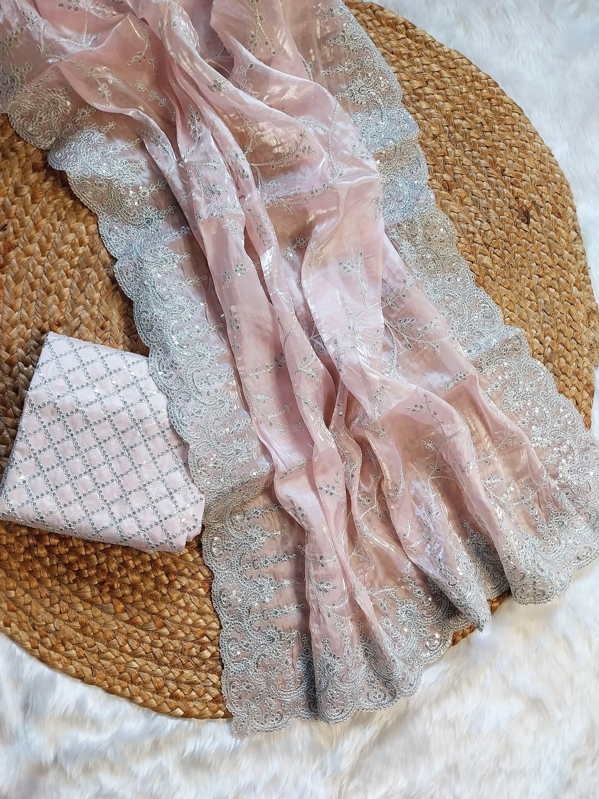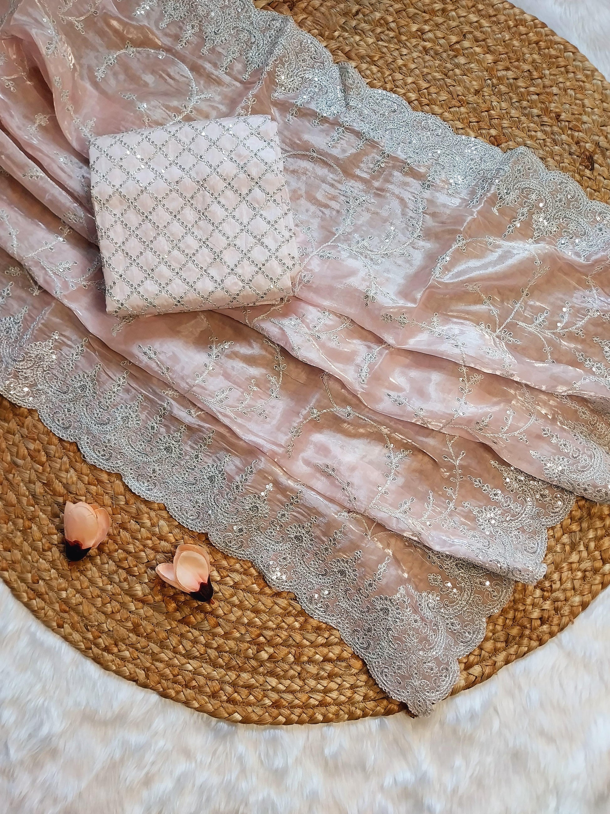 Introducing our Pure Satin Organza Silk Saree, delicately crafted to make every moment special.