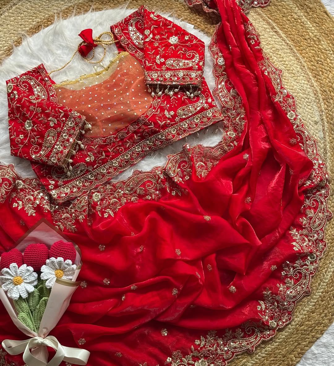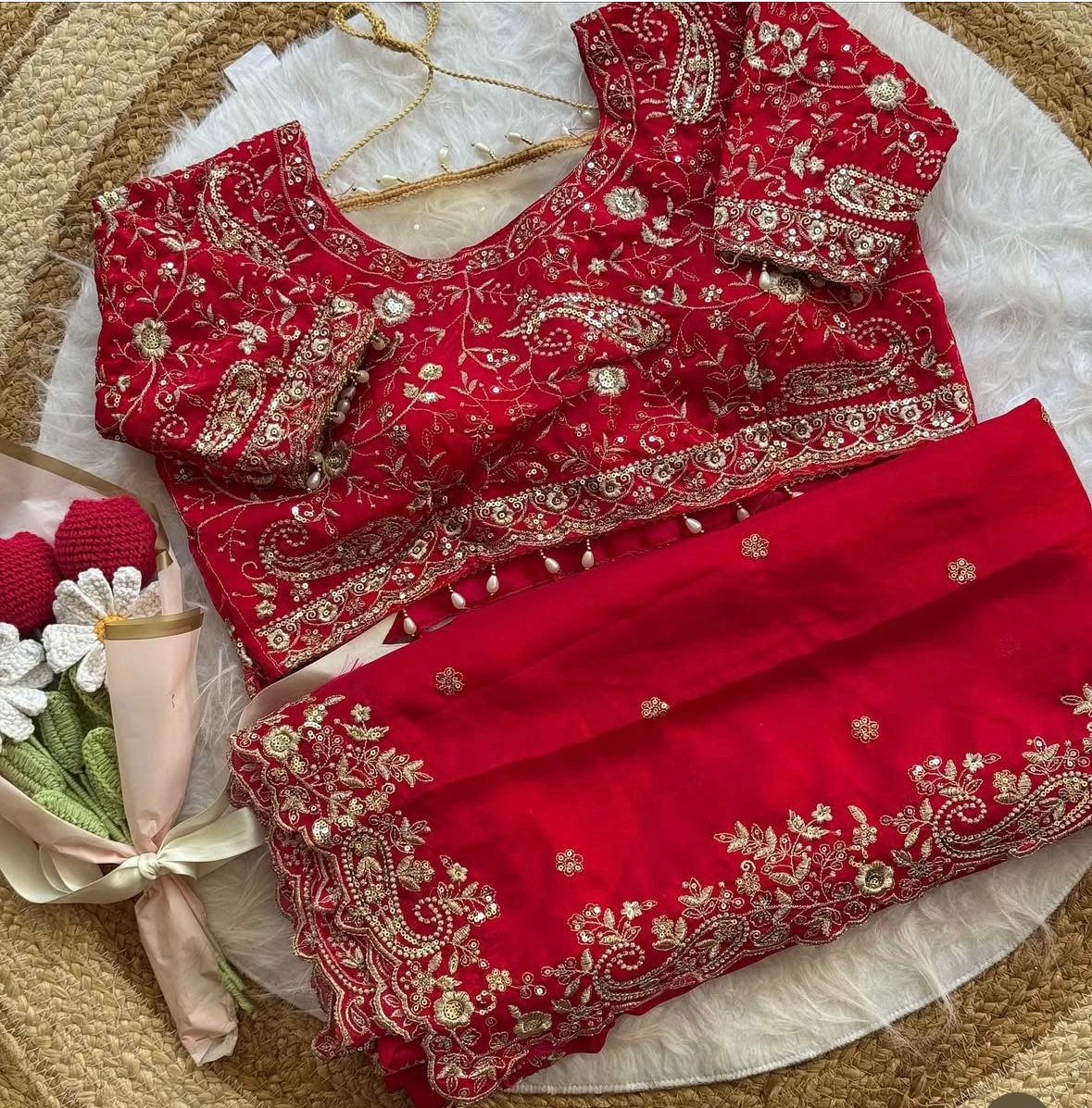 Bridal sarees often feature rich fabrics like silk, brocade, or velvet and are adorned with intricate embroidery, zari work, or embellishments. Popular choices for bridal sarees include red, gold, or maroon, as they symbolize prosperity and tradition.
